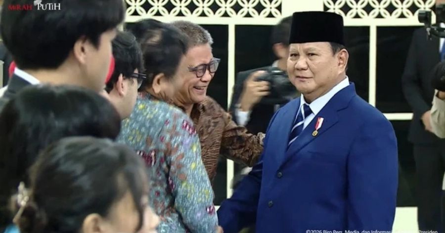 Pasca-prosesi pelantikan selesai, momen menarik terjadi ketika Presiden Prabowo Subianto menghampiri barisan tamu. Rocky Gerung terlihat memberikan gestur hormat sebelum akhirnya bersalaman dengan orang nomor satu di Indonesia tersebut.